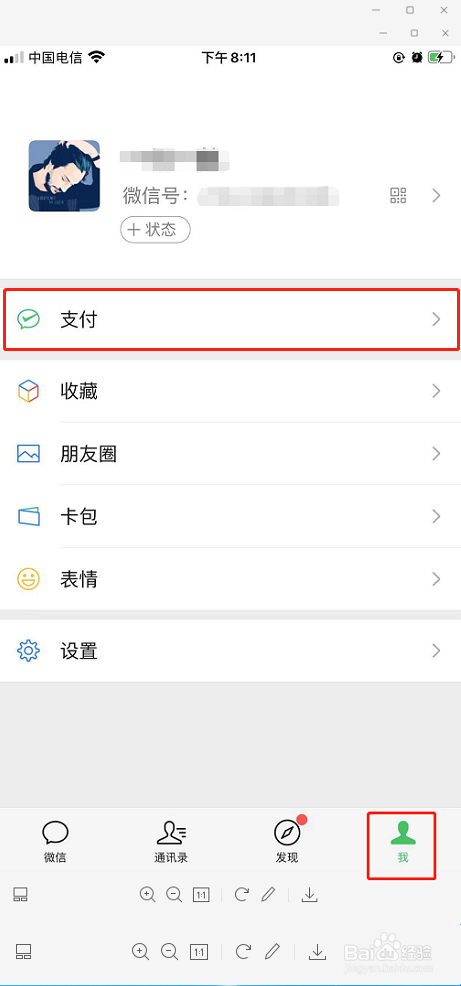 首先,打开手机微信App,在页面底部菜单栏依次点击【我】---【支付】。