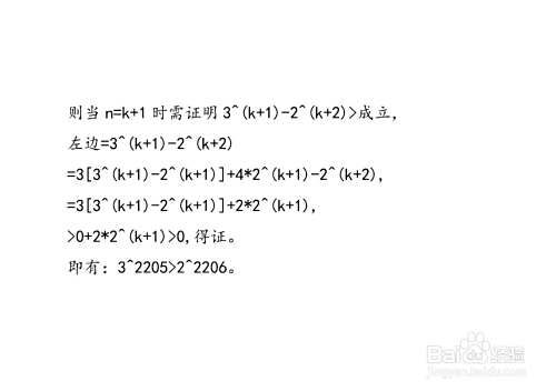 则当n=k+1时需证明3^(k+1)-2^(k+2)>成立,