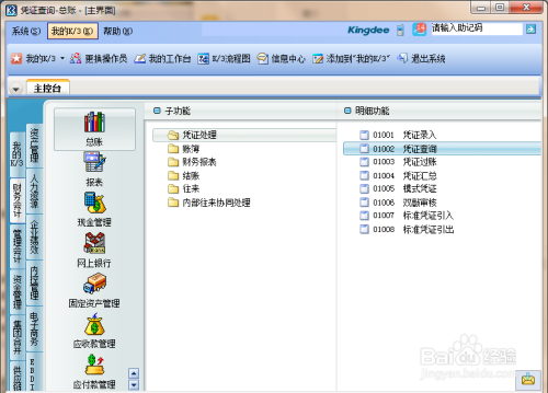登录系统之后,点“财务会计”-“总账”-“凭证处理”-“凭证查询”。