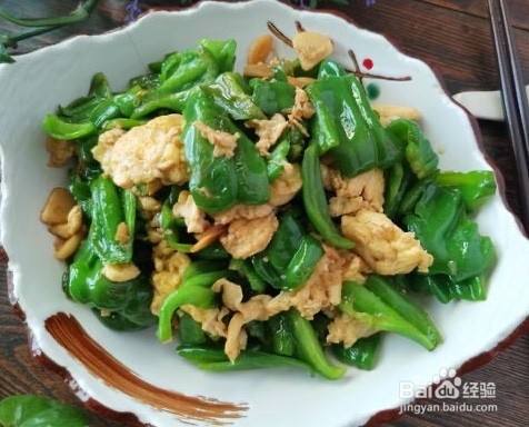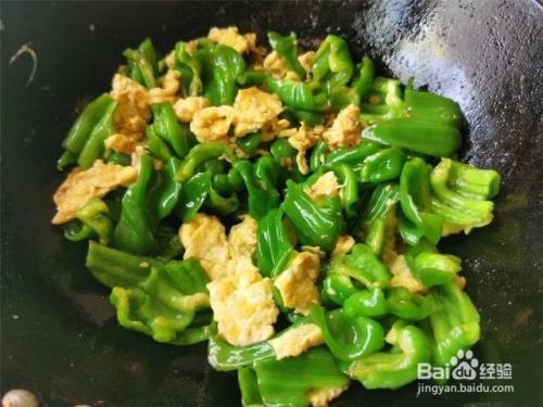 第七步,待青椒断生时,把鸡蛋块倒入锅中,翻炒2分钟。