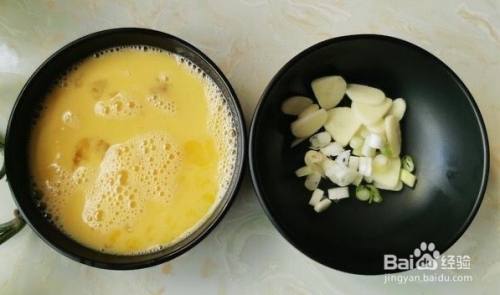 第三步,把三个鸡蛋磕入碗中,加适量的食盐,少许温水,搅拌均匀,姜切片,蒜切丁。