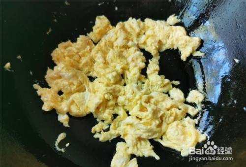 第四步,锅中倒入适量的食用油,烧热后,把鸡蛋液打入锅中,待鸡蛋凝固,用铲子划散后盛入碗中。