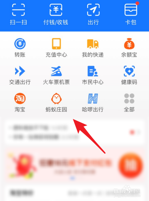 进入到支付宝页面,找到【蚂蚁庄园】入口,点击打开它