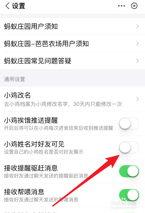 在蚂蚁庄园设置页面上,找到【小鸡姓名对好友可见】选项,点击关闭其右侧的开关