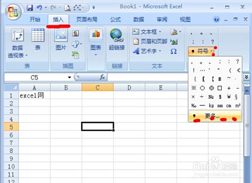 在“特殊符号”组中单击“符号”下拉按钮,在弹出的下拉列表中选择“更多……”选项。