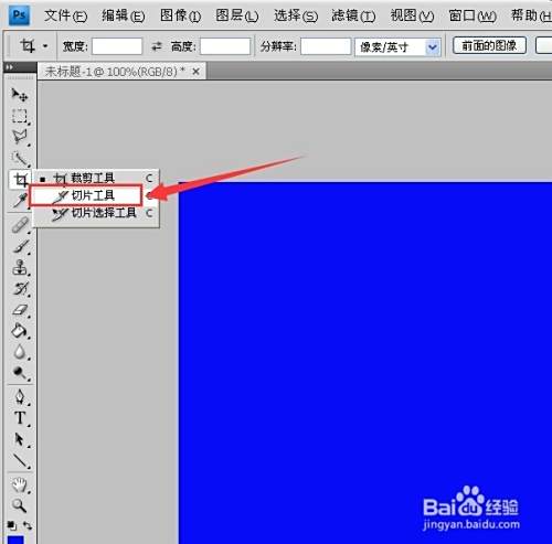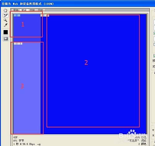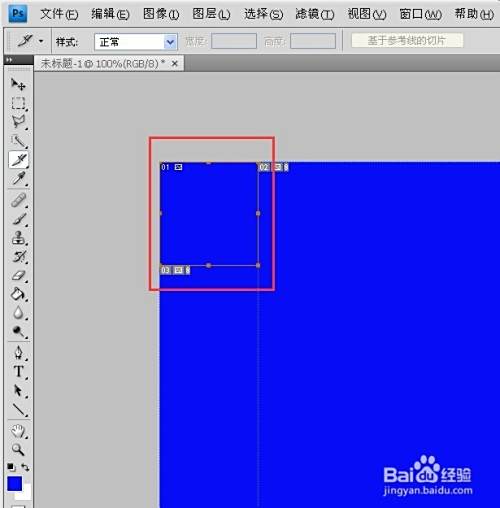 利用切片工具进行图片切割,切的部分会有虚线分辨的。(本文利用一张蓝色图片进行讲解,切片关于后期插入超链接所用,你切在哪个位置网页中点击你当时切的位置才会产生超链接效果的,当然你这张图片可以插入多个超连接,只要你多切几下就好了,至于怎么切,还得自己规划。)