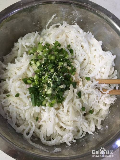萝卜切丝后放少许盐腌出水,用水冲洗干净后挤出水分,放入盐,白胡椒粉,鸡精,葱花,花椒粉,米粉拌匀,最后再放入香油拌匀。这里有个重点就是萝卜丝里的盐可不要多啊,因为腊味本身会咸。