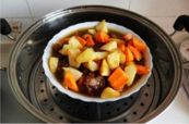 随后准备好蒸锅,把刚炒好的胡萝卜和土豆放在刚焯好的牛尾上 。浇上美味的牛尾汁,然后中火蒸20分钟左右 。