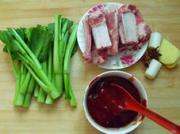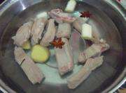 2排骨焯水,加葱姜八角煮半小时,捞出控水,排骨汤不要倒掉。