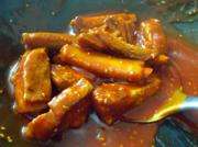 传统的是绛红色,主要是酱油,料酒之类的,味道有点重。我自创的这个,口味酸甜微辣,朋友都觉得特别棒,推荐给大家!