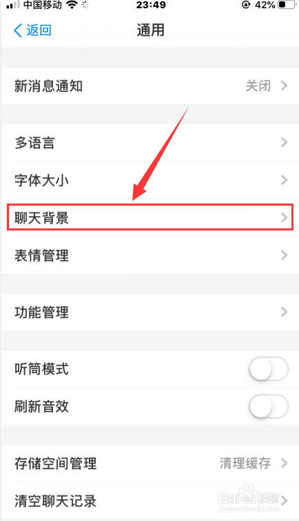 在通用里点【聊天背景】选项。