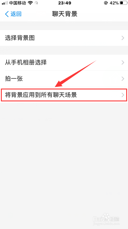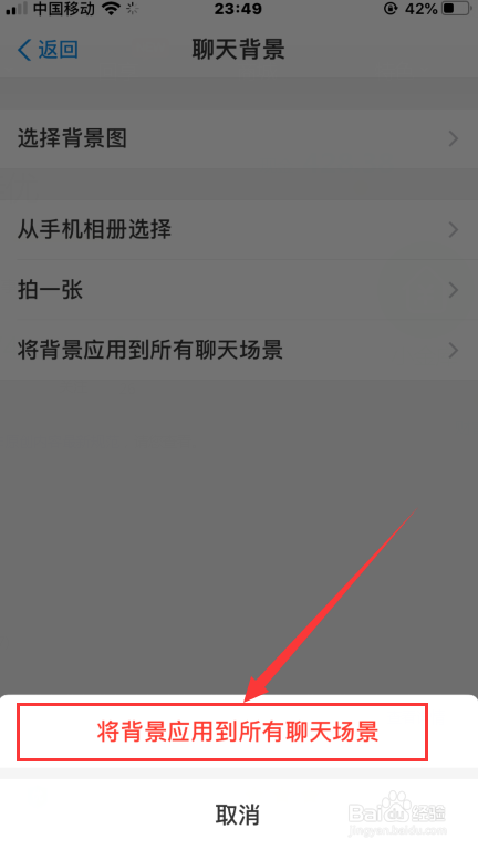 在聊天背景页面点【将背景应用到所有背景】,在弹出的窗口接着点【将背景应用到所有背景】即可。