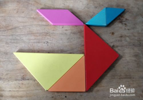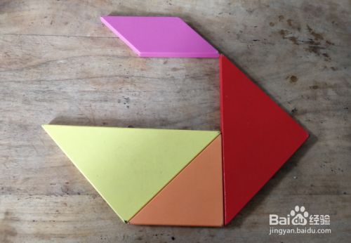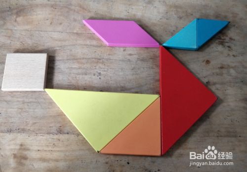摆上正方形,放在黄色三角形的左上挨着,如图。这样就完成了。
