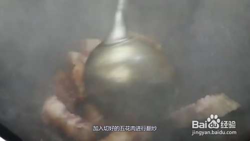 将五花肉放入锅中进行焯水,并加入黄酒去腥,将焯好水的五花肉切成块。锅烧热油加入冰糖炒出糖色,加入切好的五花肉进行翻炒。