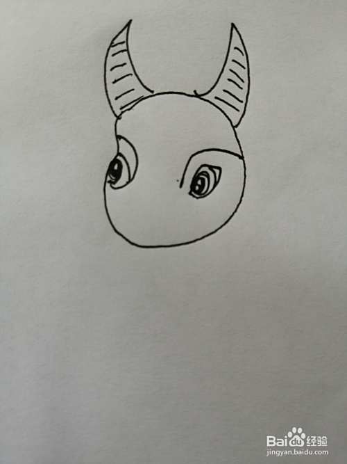第二步,接着在可爱的小牛的头部里面画出两只黑色的大眼睛,小牛的眼睛很漂亮。