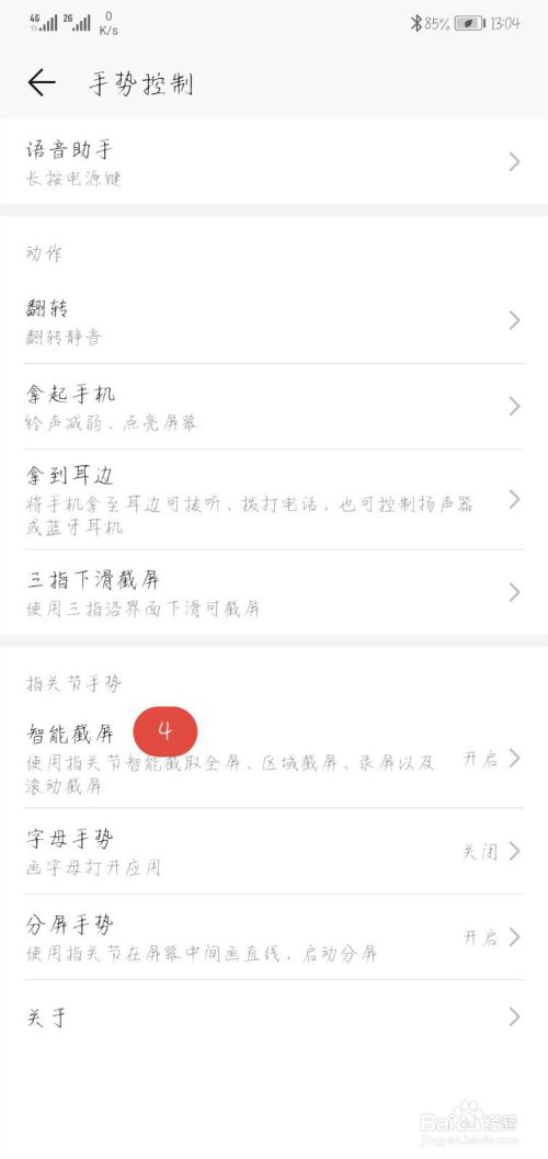 在手势控制的页面,可以看到有多种手势有关的快捷方式,在最下方,有一个智能截屏方式,我们将其开关打开就可以使用指关节双击屏幕截屏的操作了。