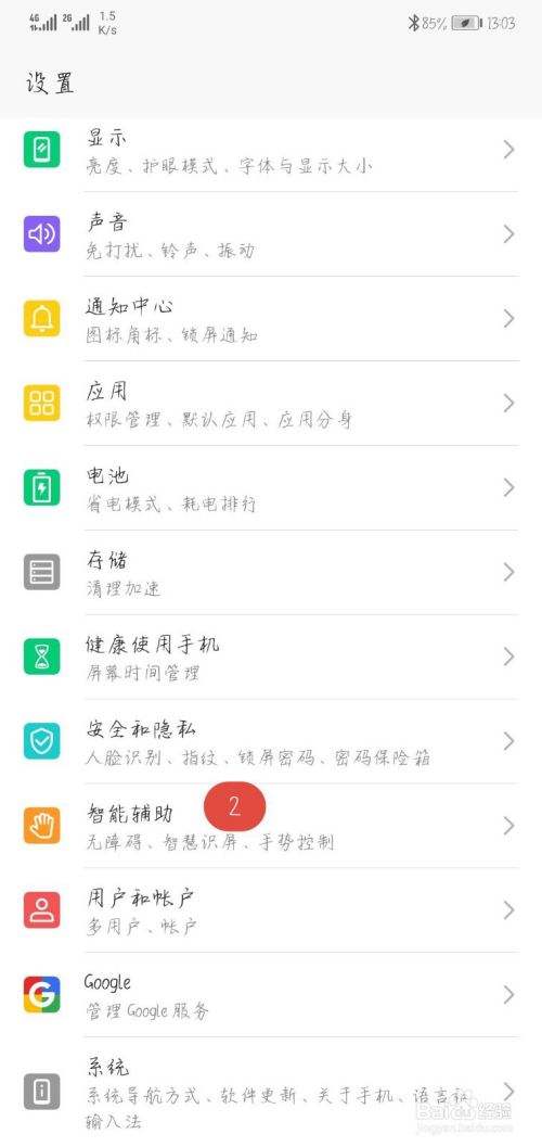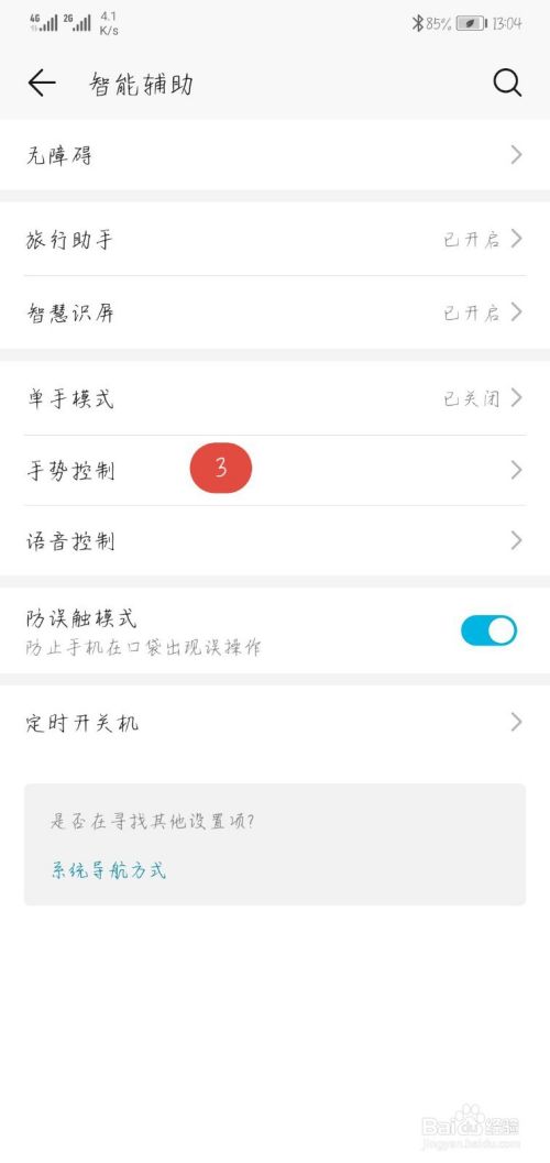 打开设置之后,我们需要在其中众多选项中找到智能辅助,其中有手势控制,可以开启截屏的手势擦作。