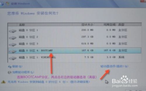 选择BOOTCAMP分区,点击驱动器选项(高级),选择好BOOTCAMP分区后点击格式化,点击下一步安装Windows 7系统。