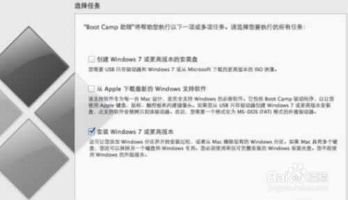 等Windows 支持文件下载完成后点击退出,插入Windows 安装U盘或者光盘,启动Boot Camp助理,选择安装Windows 7 或更高版本。