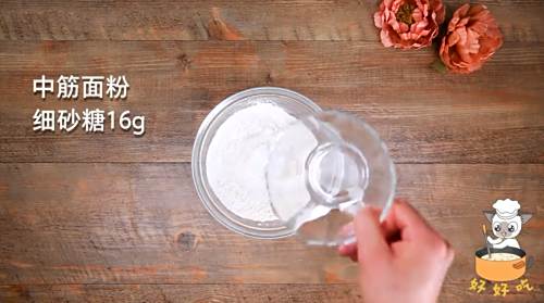 1准备中筋面粉150g,盐1g,油,小苏打2g,蛋液45g,细砂糖16g。