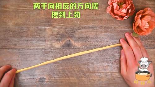4两手向相反的方向搓,搓到上劲将面条对折,面条自动缠绕,每个重复此操作一次。