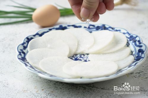 萝卜用盐腌制出水,萝卜片就会变软,这样容易夹肉馅,摆盘也更好看。