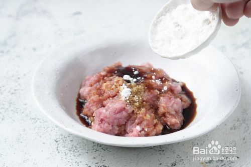 肉糜放入碗中,加入10克蚝油、15毫升生抽、2克白糖、3克盐、5克淀粉,用筷子搅拌均匀,腌制一会儿。