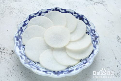 白萝卜洗净不用去皮,用刀切成薄片,放入盘中。