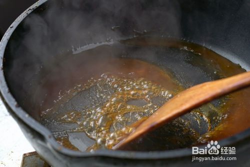 酱汁倒入锅中小火加热,一边煮一边不停搅拌,煮至浓稠起泡。
