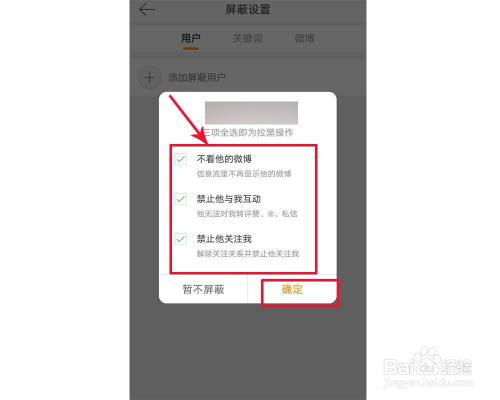 3.在【屏蔽设置】中添加联系过的人或者关注的,弹出三个选项勾选,【确定】拉黑后,就不会联系上了,