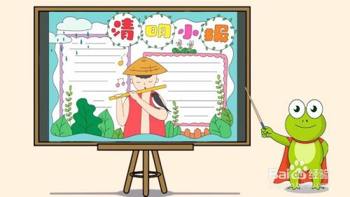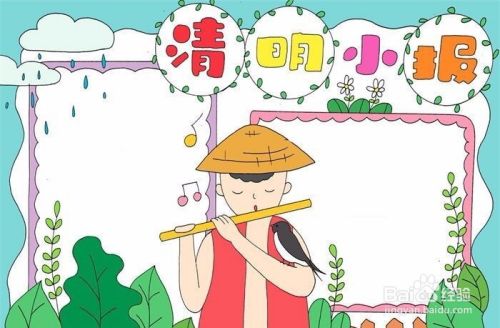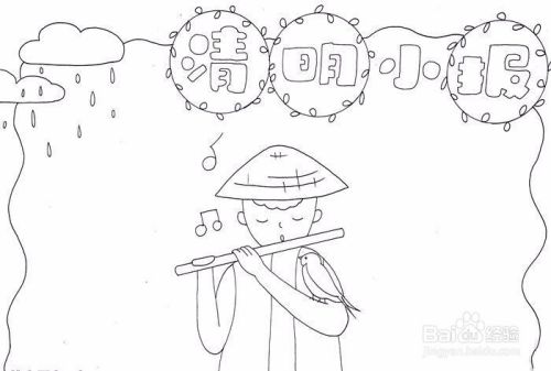 首先在右上方画上报头文字“清明小报”,将其中三个字加上圆形边框和叶子,再画出背景边框,左上角画上两朵云,下面画一些雨滴,中间再画一个吹笛子的少年,他戴着斗笠,手上停歇着一只小鸟,旁边画上音符。