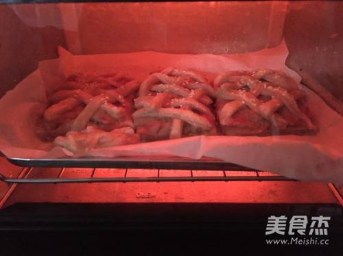 9用烘培纸垫在托盘上,预热完烤箱就可以放入烘烤。