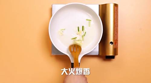 7锅中加入10ml油、姜片、葱段和蒜片大火爆香。