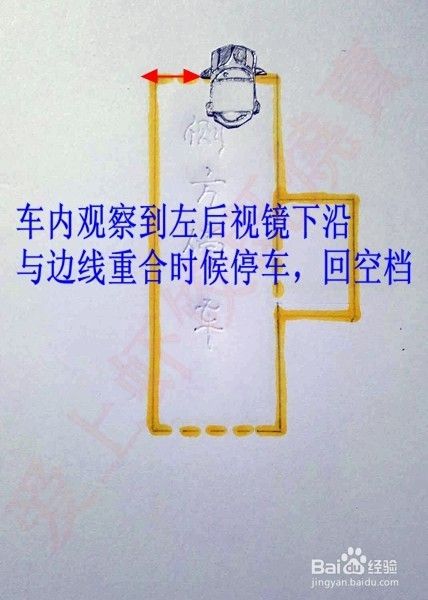 在车内观察到左后视镜下沿与边线重合时候停车,回空档。