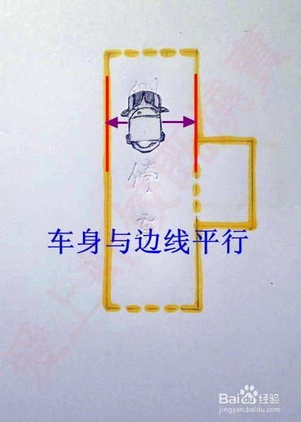 打右转向灯(一定要记得!!),挂倒挡,从右后视镜观察车身与边线的情况,保持30厘米左右的平衡距离。