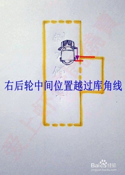 当右后轮中间位置越过库角线时候,迅速向右打满方向。