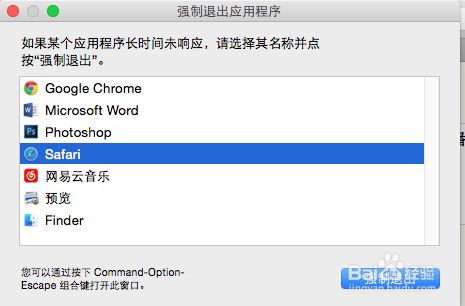 技巧四:任务管理器强制关闭。有些软件后台运行,按command+tab是看不见的,应使用alt+command+esc,选择不使用的软件,强制关闭