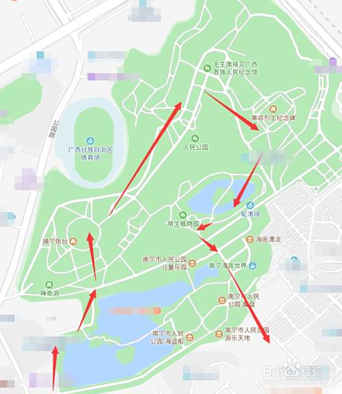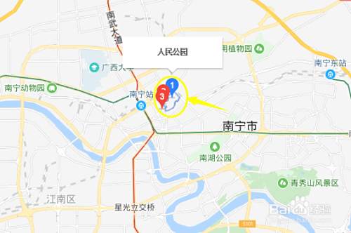 如图所示南宁市人民公园在新民区新兴路,具体位置离朝阳广场和南宁火车站不远。