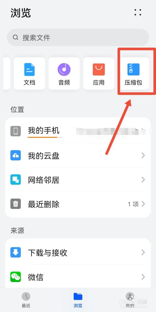 打开手机进入文件管理,选择页面里的压缩包选择项