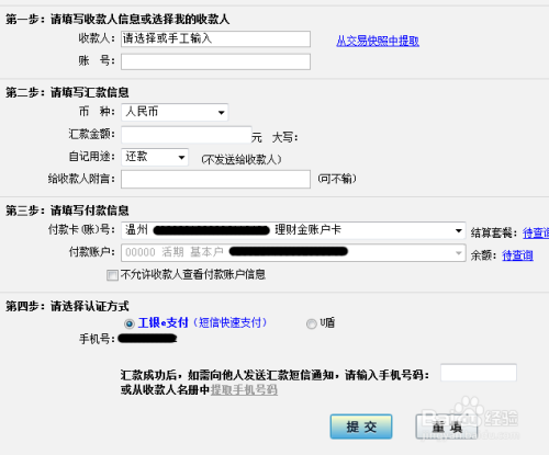 然后输入要转入的账户和卡号(如果以前保存过,可以点”收款人”就会出现选择),再输入需要转出的金额,以及转出的卡。如果还有给付款人附言(付款人可以看到)的或者注明汇款用途(给自己看的,收款方看不到)可以填写一下。