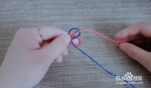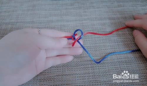 接着将红线绕左手食指做一个圈,然后穿过蓝圈。