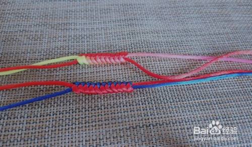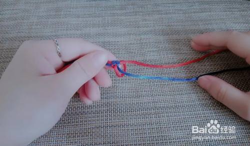 然后按照之前翻转的方向,把结体上下翻转,重复之前的步骤,用红线绕食指做圈,并穿过蓝圈。