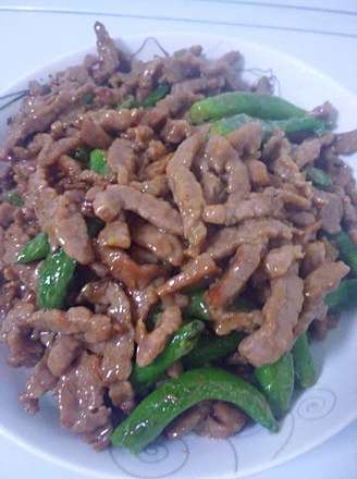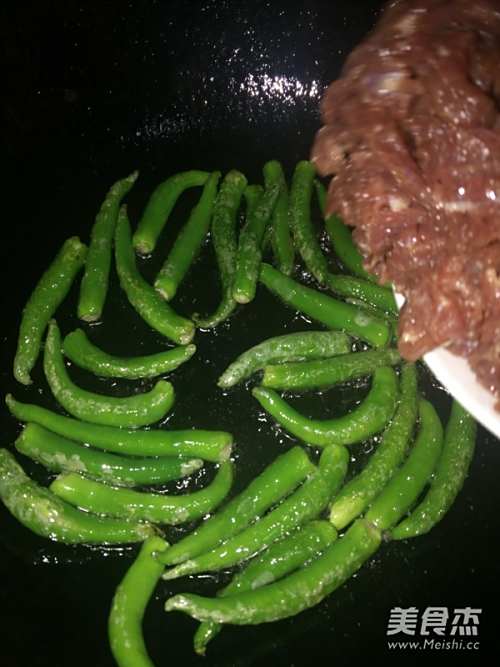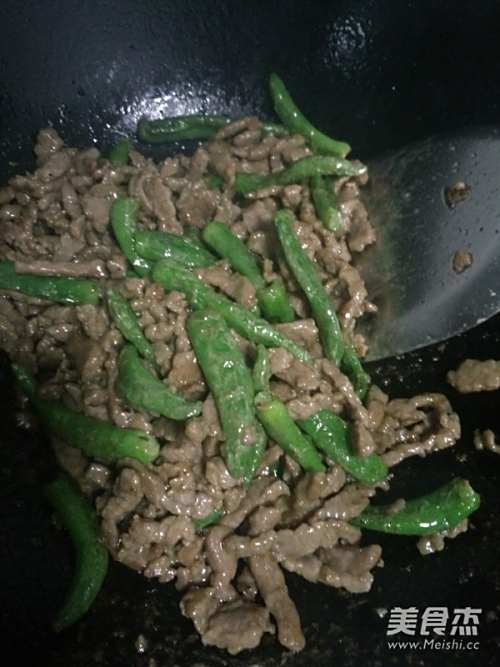 等到杭椒表皮变色后加入牛柳,快速滑炒