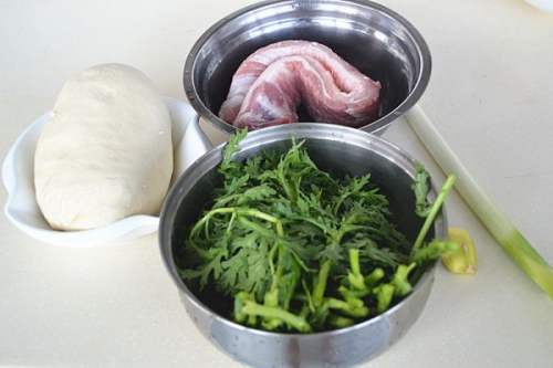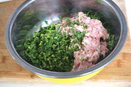 5猪肉,茼蒿,姜剁碎倒入盆里。
