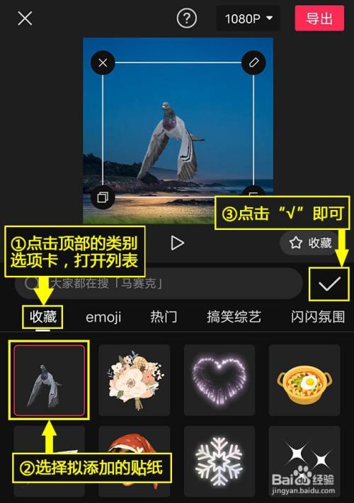 添加贴纸。点击顶部的类别选项卡,打开列表,选择拟添加的贴纸,点击右上角的“√”即可。