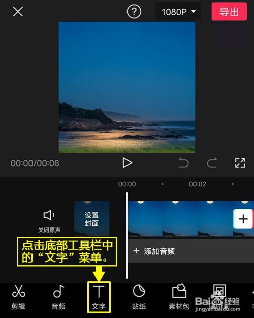 点击文字。点击底部工具栏中的“文字”菜单。