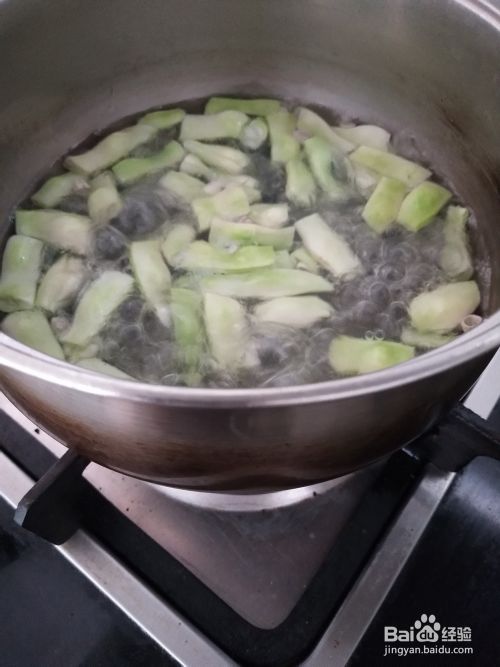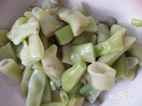 豆角,50克。摘好。洗净,切成小段。焯水待用。