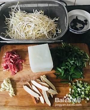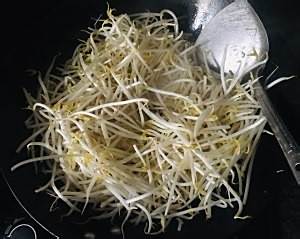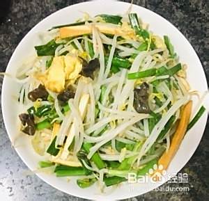 热锅凉油放入葱末香干丝、木耳丝。倒入炒好的鸡蛋和煸好的豆芽菜。最后放入韭菜、盐少许、香油翻均关火。