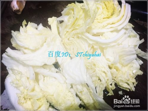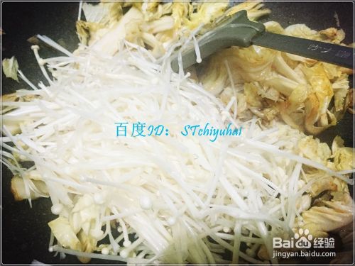 一会加入白菜叶、金针菇,混合翻炒一阵。