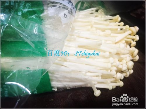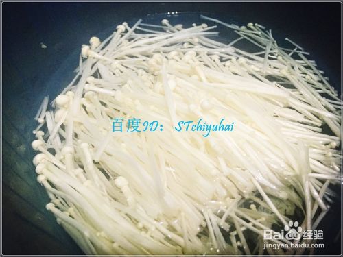准备半包金针菇,切去头部带土部分,然后过水洗净,沥干备用。